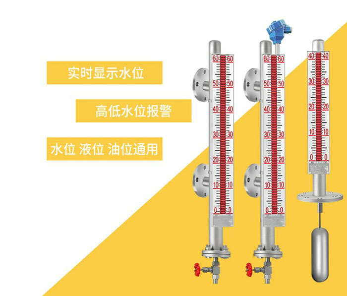 磁翻板液位计测量液体时采用顶装或旁通管侧装方式。磁翻柱主体外加装翻柱液位指示器、液位开关及液位变送器。磁单元置于浮球内部或通过顶杆与浮球相连,当浮球连带磁单 元随液位变化时,使磁性色块(磁翻板)翻转;磁性液位开关在对应液位点动作;同时液位传感器在浮球磁力的作用下,输出标准的变化电阻信号,再经过变送器把电阻信号转换 成4~20mA电流信号输出。